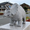 のんほいパークの入口までは、ここから歩いて500mほど。ワウワクさせるおもてなしの恐竜石像! 変な子もいる・・・