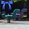 ゲームタイム社の恐竜型スプリング遊具があるんですが、緑バージョンと紫バージョンの2体が並んで設置されています!