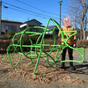 地元では三角公園で親しまれている公園。ここにパイプでできた恐竜型ジャングルジムがあります!