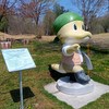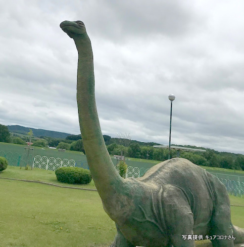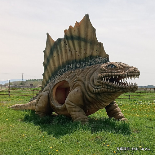カイギュウの化石が見つかる北海道滝川市ですが、この公園にはのんびり広々とした風景を眺める立派なステゴサウルス像があります。でも別の恐竜に狙われていた! タキカワカイギュウ像もありました!