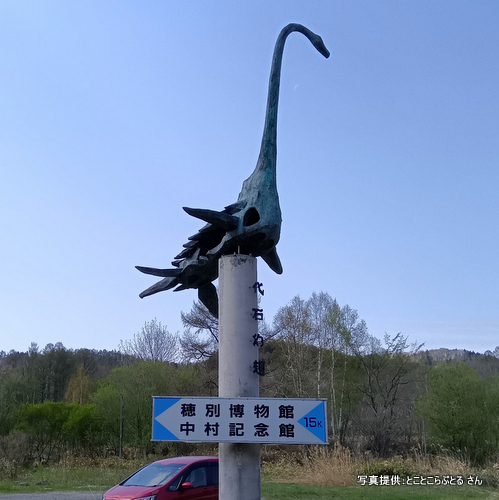 ◆ ホベツアラキリュウの化石発見地の近く国道と北海道道の分岐点にクビナガリュウのモニュメントあり!(2024/8/25)