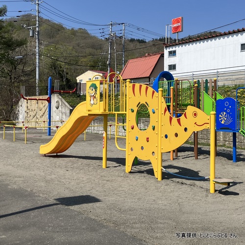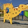 芽室公園には、ブラキオサウルスとトリケラトプスの像が一体になったチビッ子用の遊具があります。