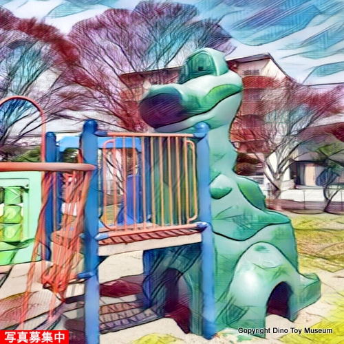 六丁の目駅に近く、仙台市荒井西土地区画整理事業で誕生した広さ2400平方メートルのゆとりの公園のひとつ。ここに青いパイプでできた中村製作所ダイナソー トリケラジュニアが1台あります。