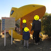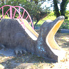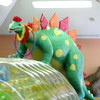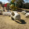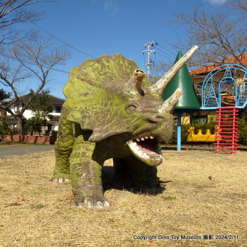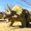 広々とした芝生のグラウンドにかわいいアニメチックな恐竜像が点在しています。紹介記事の写真には恐竜像が5体ありますね。
