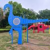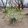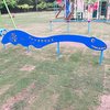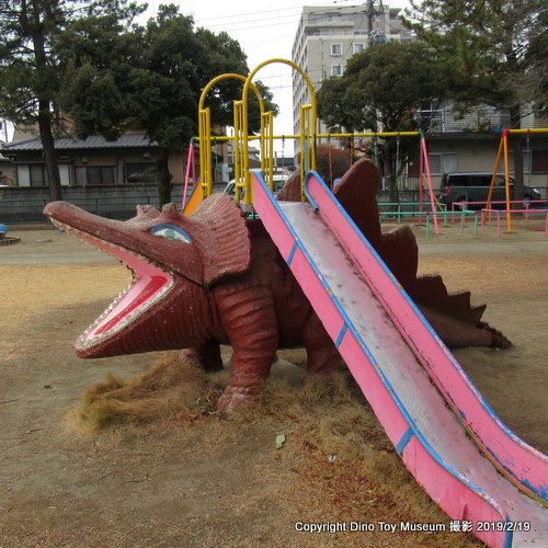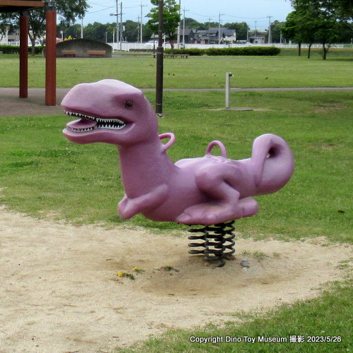 職人さんが手作りしたレトロな滑り台など、昭和な感じの住宅地の中の公園。ここにあの紫色のベロキラプトルのスプリング遊具が1台あります。