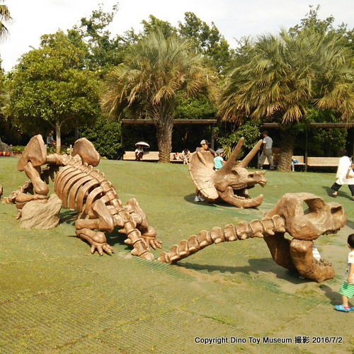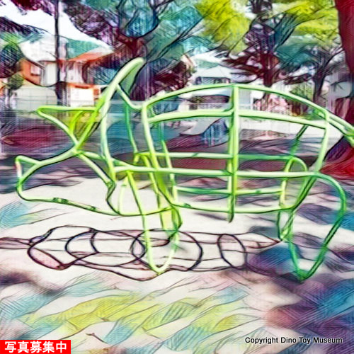こどもの国の「せせらぎ」コーナーの近くにパイプでできたトリケラトプスとステゴサウルスの形をしたジャングルジムがあります。館長もこどもの頃、こどもの国に何回か行ったことがありますよ。