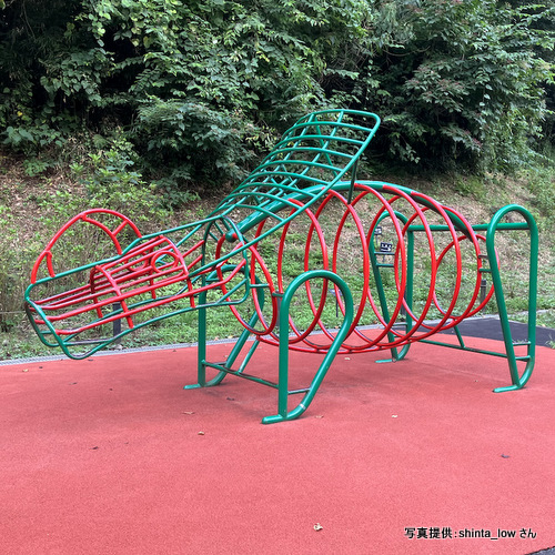 相鉄いずみ野線・いずみ中央駅から徒歩10分ほどの住宅地の中の広々とした上飯田南公園に、トリケラトプス型のジャングルジムがあります。神奈川県は恐竜型のジャングルジムが好き?