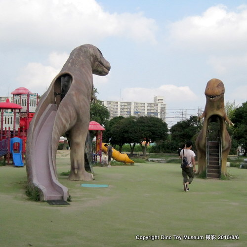 愛知県名古屋市緑区にある緑地公園。この中の恐竜広場に恐竜モニュメントがあります。でっかい2匹のティラノ(高ちゃんと大ちゃん)滑り台がありますね!