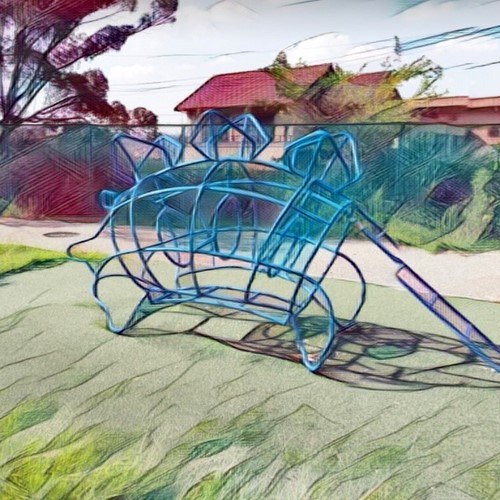 住宅地の中の公園。ゾウの形のジャングルジムはゾウの鼻がすべり台になっている! この公園には、ティラノサウルスの形のジャングルジムもあります。