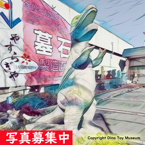 Googleストリートビューで見ると、「円遊型ガーデンスタイル墓石展示場」の入り口にトリケラトプスの石像が、その奥に平らな石材パーツを組み合わせたトリケラトプスのような像が見える? maimaiさんから情報を、牧野友次郎さんから写真をいただきました。ありがとうございます!