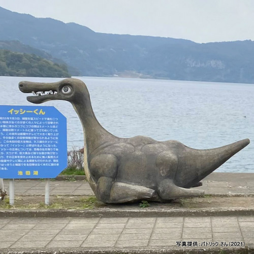1975(昭和50)年4月に桜島自然公園として開設し、その後、1984(昭和59)年7月22日に恐竜模型設置により桜島自然恐竜公園に改名=恐竜の誕生日と判明、恐竜たちのメーカーについては記録が見つかりませんでしたが、作品の姿からみて日東商事の作品と思います。