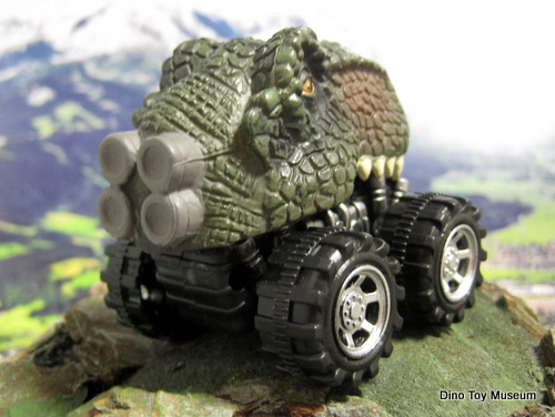 ![]() ティラノサウルスの頭の上半分が大きなタイヤの四輪駆動車に載っている不思議なおもちゃ。プルバックゼンマイ方式で車を後ろに引っ張り手を放すと勢いよくダッシュします。このシリーズは動物や鳥の頭が載った多くの種類があり、その中に恐竜が4種類あります。3種類は以前、高速サービスエリアの売店で見つけて、残り1種類を探していたのですが、九州を旅行した時に泊まったホテルのお土産コーナーで最後の1種類、ティラノサウルスをゲットしました。 ティラノは後方のノズルが4個並び、ここから勢いよくロケット噴射するイメージかな? とっても力強そうです!